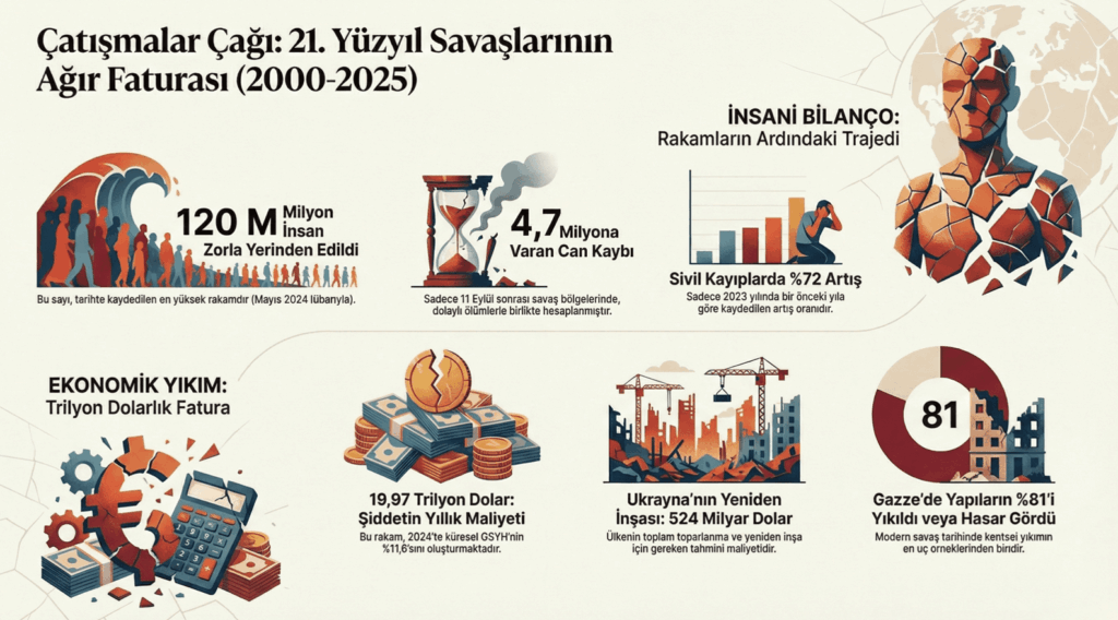Dünya genelinde çatışmalar, savaşlarla, yıkımlarla dolu bir 25 yılı geride bıraktık. 2025 yılı itibarıyla küresel düzeyde çatışmalar, kuraklık, afetler, ekonomik krizler nedeniyle 120 milyondan fazla insan yerinden edildi. Rusya- Ukrayna savaşı büyük insani yıkımın yanında ağır bir ekonomik tabloyu da getirdi beraberinde. İsrail’in Gazze’ye yönelik başlattığı kıyım, dünya kamuoyunda infiale yol açarken bağımsız kaynaklar büyük bir çoğunluğu siviller, kadın ve çocuklar olmak üzere 70 binden fazla insanın saldırılarda hayatını kaybettiğini, Gazze’nin %81’inin yerle bir olduğunu ortaya koyuyor.