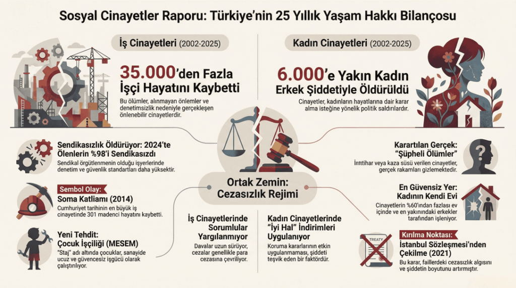 Türkiye açısından da son 25 yılın bilançosu çok ağır. İşçi ve kadın cinayetleri ne yazık ki önlenemiyor. Bağımsız kaynaklar 2000-2025 arasında en az 35 bin işçinin iş cinayetlerinde, 6000 den fazla kadının da erkekler tarafından işlenen cinayetlerde hayatını kaybettiği biliniyor. Milli Eğitim Bakanlığı tarafından başlatılan MESEM uygulaması Türkiye’de çocuk işçiliğinin yeniden gündeme gelmesine yol açarken, staj adı altında ucuz iş gücü olarak sermayenin kullanımına sunulan çocuk işçiler iş cinayetlerinde hayatlarını kaybediyorlar.