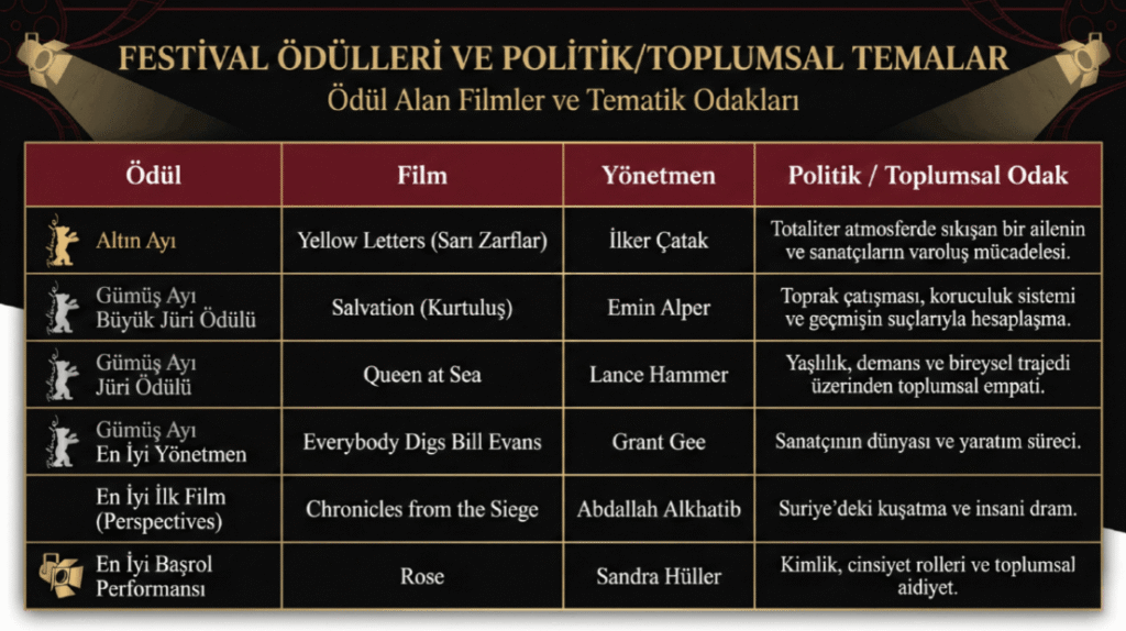 2026 ödülleri, bu kronolojiye Türk sinemasının en güçlü politik halkalarından birini de eklemiş oldu… Üstelik festivalin en değerli iki ödülünü de Türkiye’ye götürmeyi başaran iki yönetmenle…