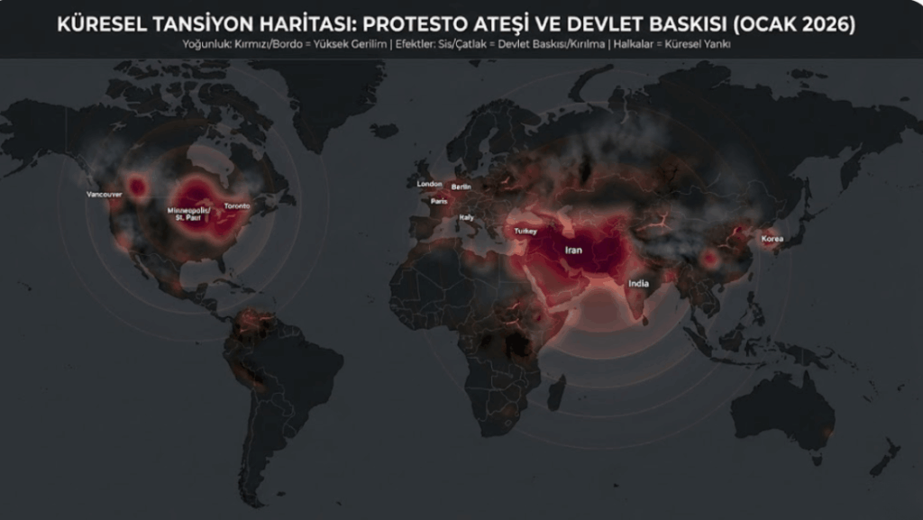 2026’nın üçüncü haftası, tarih kitaplarına “Küresel Huzursuzluk Haftası” olarak geçmeye aday. İran’da rejim “Kadın, Yaşam, Özgürlük” sloganlarıyla sarsılırken, Paris traktörlerle kuşatıldı. İstanbul’da kuryeler kontak kapattı, Bursa’da işçilere “dere suyu” içirildiği ortaya çıktı. Uganda’da demokrasi internet fişiyle çekilirken, Amerika kendi içindeki “ICE” isyanıyla boğuştu.
