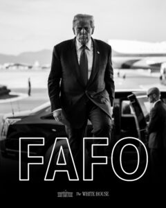 Beyaz Saray’ın resmi X hesabından Başkan Trump’ın fotoğrafıyla birlikte yayınlanan “FAFO” ifadesi yeni dünyaya ilişkin “felsefenin” çarpıcı sembolü olarak değerlendirildi.
