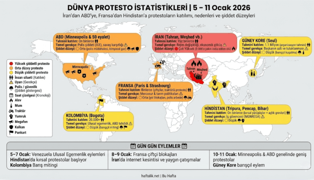 Bu Hafta Minneapolis’ten Tahran’a, Caracas’tan Gazze’ye dünya farklı talep ve sloganlarla ayaktaydı. Yeni yılın ilk tam haftasında sokaklar, sınırlar ve ekranlar aynı anda hareketlendi. Protestolar yayıldı, diplomasi zorlandı, küresel ekonomi daha da kırılganlaştı.