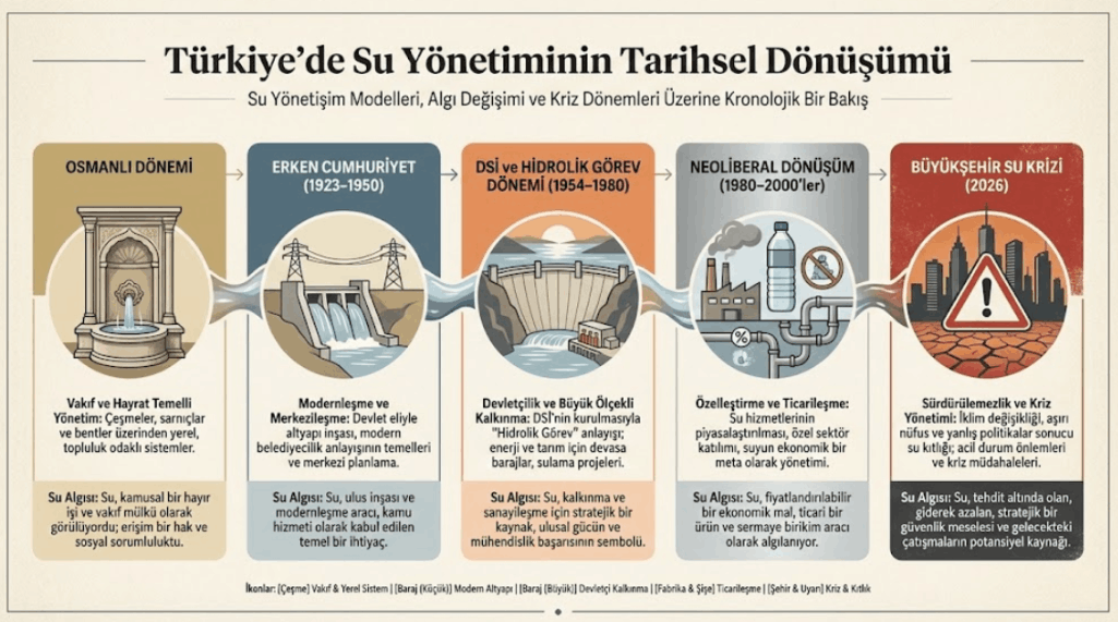 Türkiye’de su yönetiminin bugünkü yapısını anlamak için gelin tarihsel süreçte Osmanlı yerel/vakıf temelli yönetim anlayışından, Cumhuriyet’in merkeziyetçi ve mühendislik odaklı yapısına, günümüzün neoliberal tercihine, devletin su ile kurduğu ilişkinin nasıl evrildiğine bakalım.