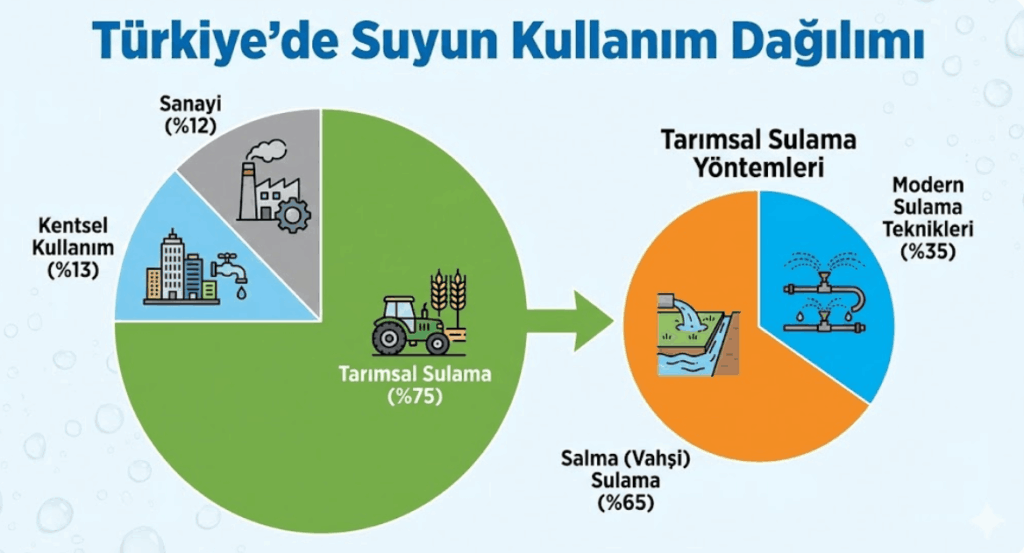 Türkiye, su kaynaklarının yaklaşık %74-77’sini tarımsal sulamada kullanıyor. Bu sektördeki en küçük bir verimlilik artışı veya kayıp, kentsel su arzını katbekat etkileme potansiyeline sahip.