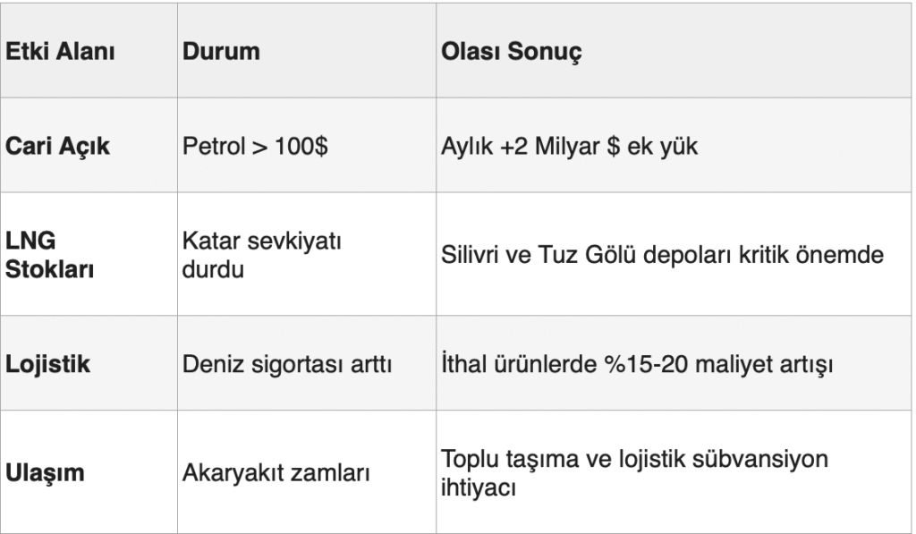 Türkiye’nin en büyük LNG tedarikçilerinden biri Katar. Katar’ın tüm sevkiyatı Hürmüz Boğazı’ndan geçiyor. Boğazın kapalı kalması, BOTAŞ’ın spot piyasadan daha pahalı gaz almasına veya sanayide kısıntıya gidilmesine neden olabilir.