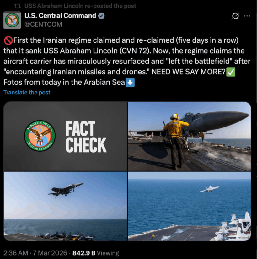 İran Devrim Muhafızları (IRGC) ve Tahran’a yakın sosyal medya ağları, Mart ayının başında ABD Donanması’na ait USS Abraham Lincoln (CVN-72) uçak gemisinin Hürmüz Boğazı yakınlarında balistik füzelerle vurularak batırıldığını iddia eden videolar dolaşıma soktu.4